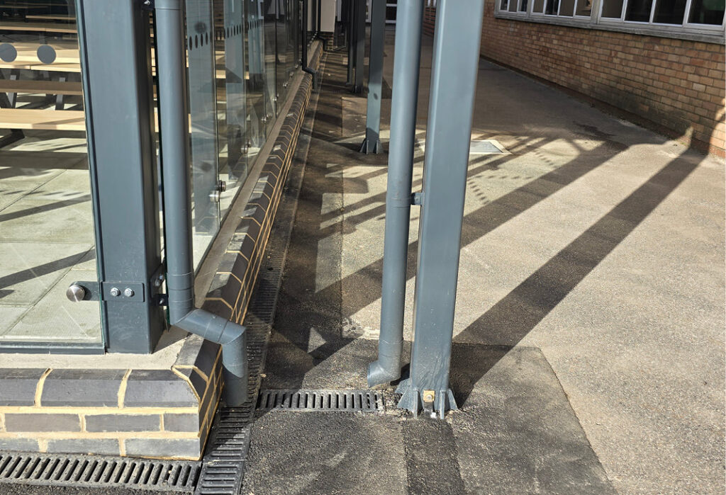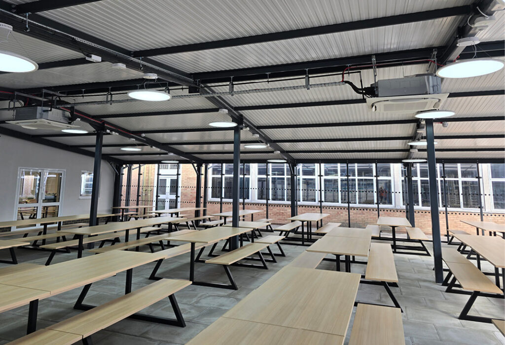 The space is directly supported by the queue canopy installed between buildings, which provides covered, orderly access and prevents bottlenecks at peak times. This section allows students to queue under cover and is a perfect use of otherwise lost space between buildings.
